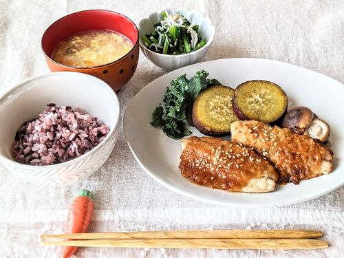 『アジの柚子味噌焼き』がメインディッシュの美肌定食です。 ◆アジで皮ふの源・良質なたんぱく質を補給 ◆アジで良質なオイルを補給 ◆さつまいもと椎茸をフライパン1つで一緒に調理 がポイントです。