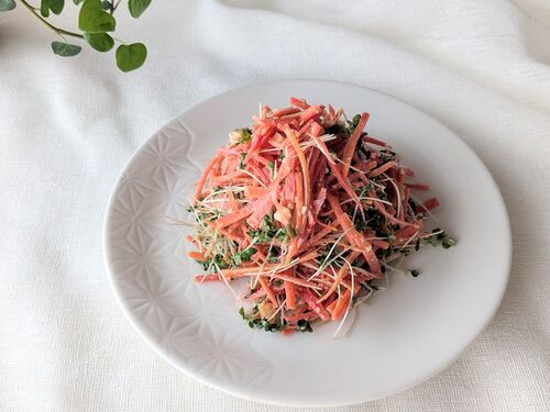 潤うお肌のためには、皮膚や粘膜の健康を維持する働きのあるβ-カロテンやたんぱく質をしっかり摂ることはマスト。 たんぱく質にツナ缶を。 β-カロテン含有量が野菜のトップクラスの人参を組み合わせたにんじんサラダです。