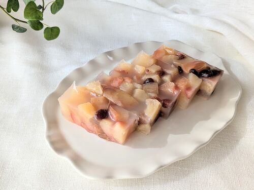 お肌を育てる【りんごとレーズンの寒天テリーヌ】をご紹介します。 蒸し煮して甘みを引き出したたりんごと、甘酸っぱいレーズンのフルーツテリーヌ。 素材の甘みを使って砂糖控えめでも、果物の自然な甘さで満足感たっぷり。 食物繊維&ペクチンが腸をサポー…