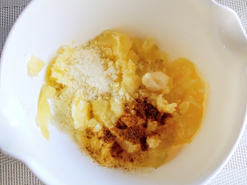 粉チーズ、にんにくすりおろし、塩を加えて混ぜる。