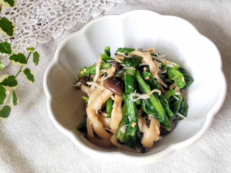 大根葉は食べやすいサイズにカットする。しめじは石づきを除いて小房に分ける。大根葉としめじを茹でて、しっかり水気を切る。