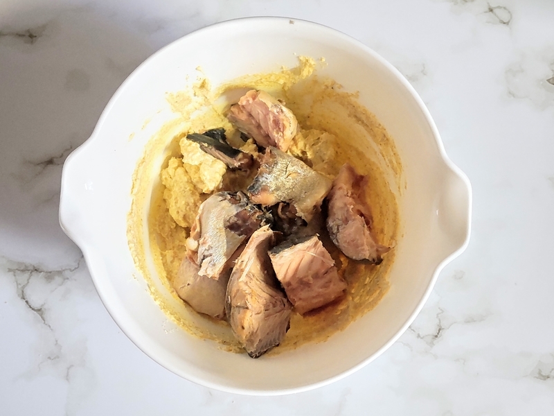 サバ水煮缶の身を加え、ほぐしながら混ぜる。-