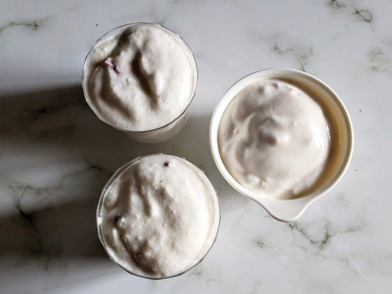 水切りヨーグルトにはちみつ、ぶどう溶かしたゼラチンを合わせてブレンダーで攪拌する。