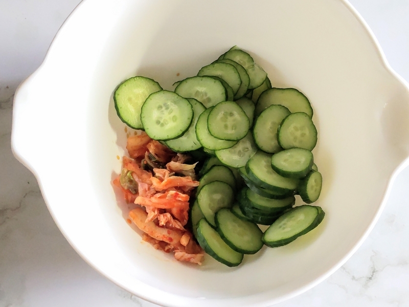 ボウルに○の材料とキムチ、きゅうりを入れてしっかり混ぜ合わせ、きゅうりをしんなりさせる。 -