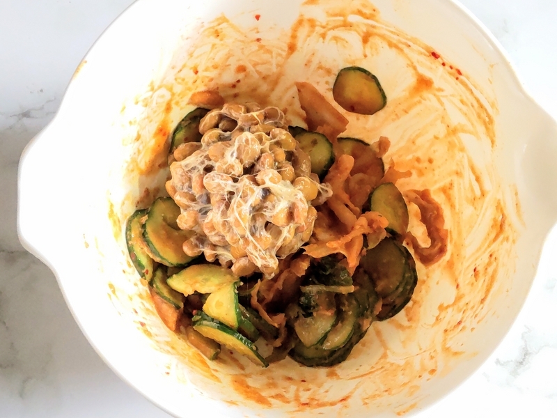 でもそれだけじゃ、ちょっとつまんないな~と思って、納豆ときゅうりを入れてみました。