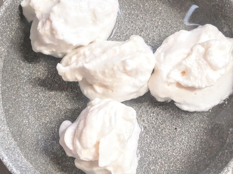 鍋にたっぷりの湯を沸かし、メレンゲを落として微沸で両面5分ずつ茹でる。(このうち2個使用) -