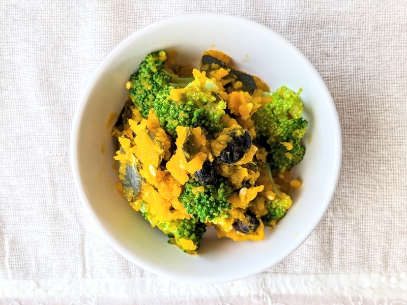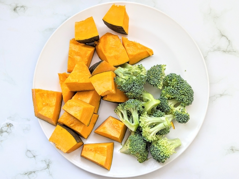 かぼちゃ、ブロッコリーを一口サイズにカットする。ブロッコリーは茹でておく。 -