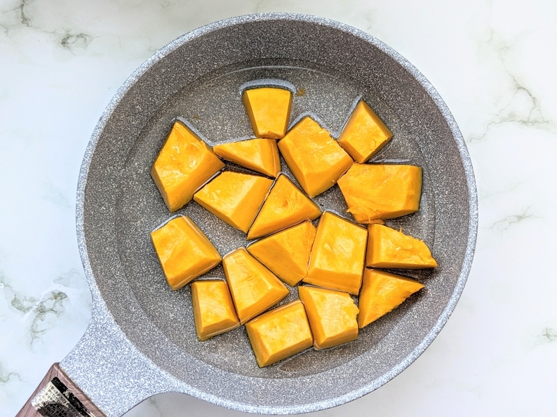 かぼちゃを蓋のできるフライパンに入れ、分量外の水を半分かぶる程度加えて火にかける。蓋をして中火の弱火で15分蒸し煮し、しっかり水分を飛ばす。 -