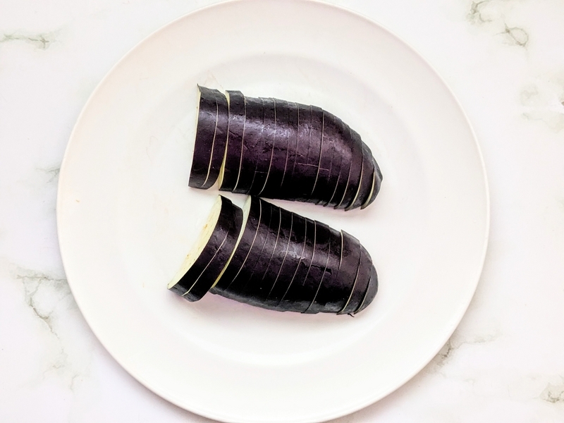 ナスを半月切りにし、トースターの低温で20分グリルする。 -
