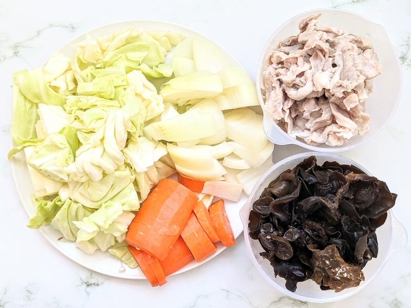 豚肉は下茹でする。キャベツはざく切り、玉ねぎはくし切り、にんじんは半月切りにする。きくらげは水で戻して食べやすいサイズにカットする。