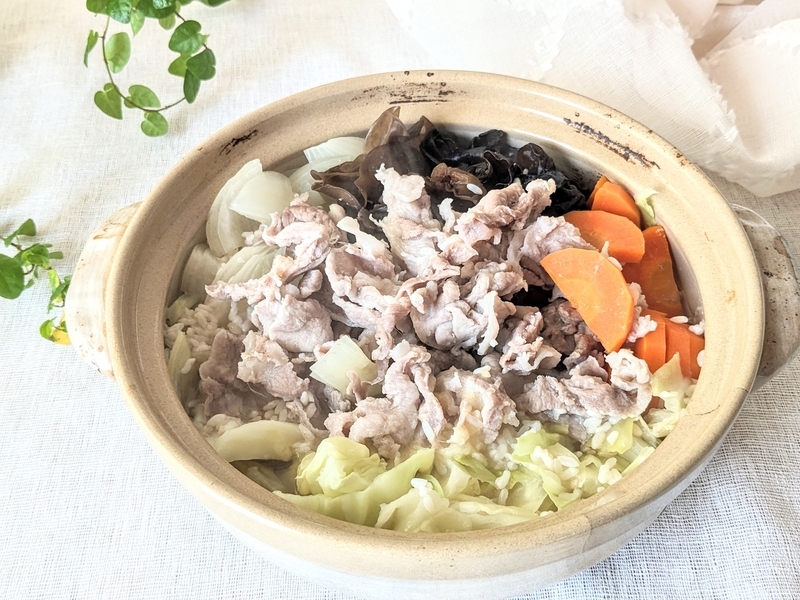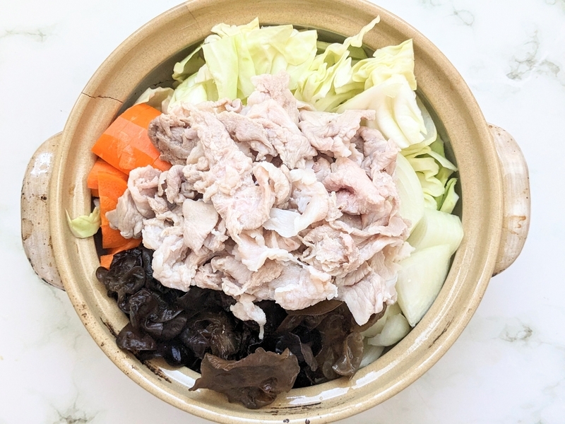鍋に豚肉、きくらげ、キャベツ、玉ねぎ、にんじんを入れる。