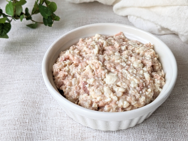 豆腐をしっかりつぶし、しっかり水気を切ったツナと塩麹、生姜を加えて混ぜる。 -