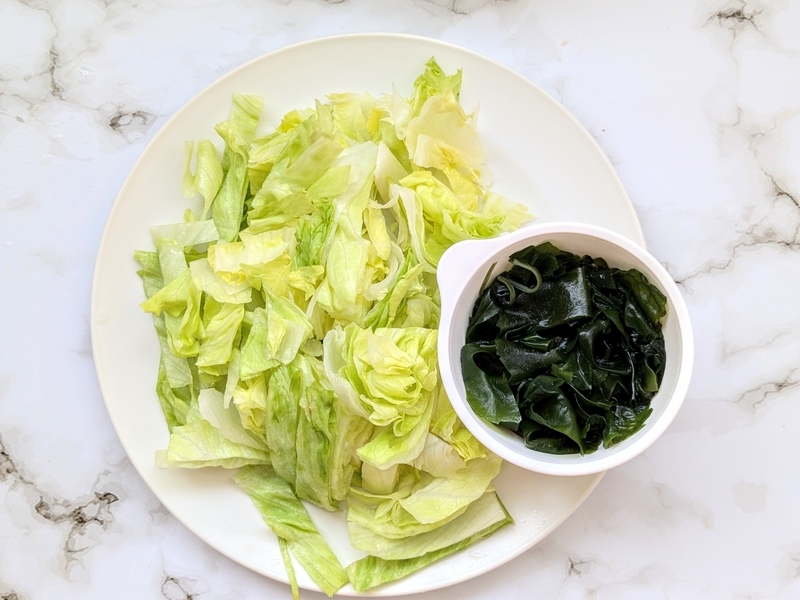 レタスを食べやすいサイズにカットし、わかめは水で戻す。