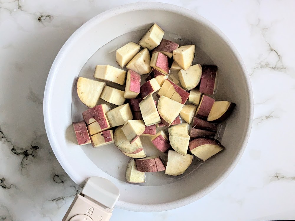 蓋のできるフライパンに入れて火にかける。フライパンが温まったら蓋をし、弱火で15分程蒸し煮する。